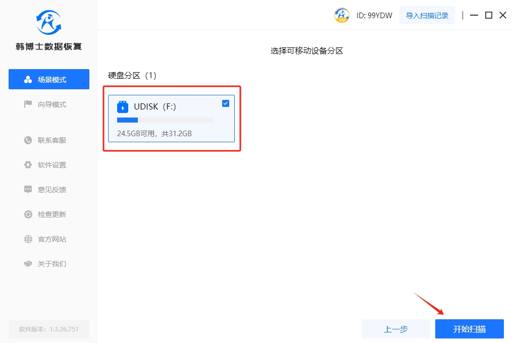 2. 接着,找到您连接的U盘,然后点击扫描按钮,以启动数据扫描步骤。