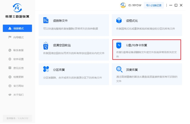 1. 下载并运行韩博士数据恢复,随后点击“场景模式”,选择“U盘/内存卡恢复”以进行相应的操作。