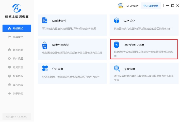 1.在电脑上安装并运行韩博士数据恢复软件,双击进入主界面,选择“场景模式”,然后点击“U盘/内存卡恢复”开始进行数据恢复。