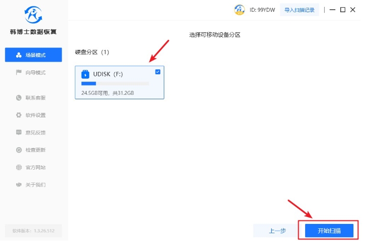 2.找到目标U盘后,按下“开始扫描”,韩博士会迅速启动,帮您扫描隐藏的文件数据。