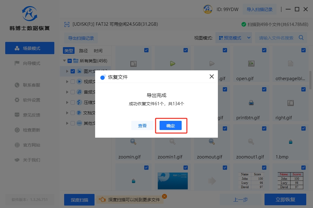 4.在扫描结束后,通过“预览模式”仔细核对文件,确保是所需数据。确认无误后,点击“立即恢复”,系统会立即进行数据的恢复。